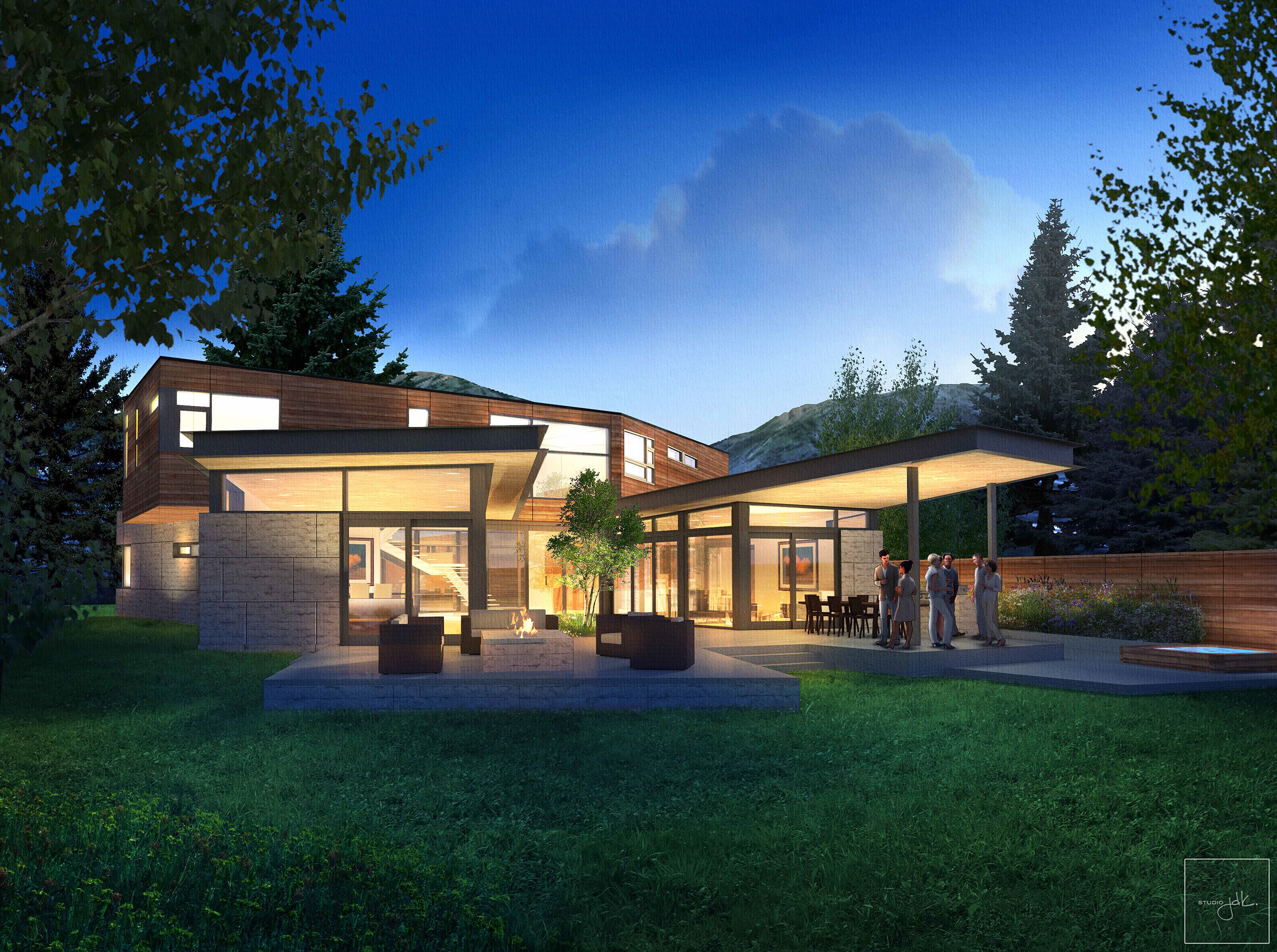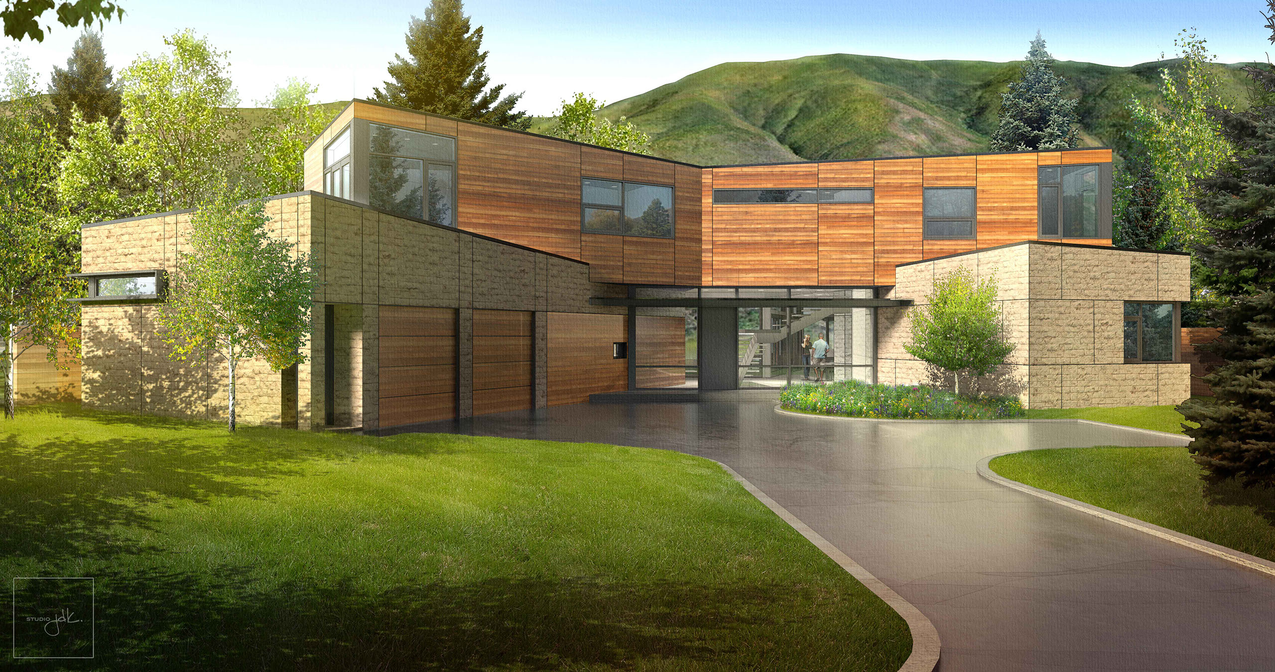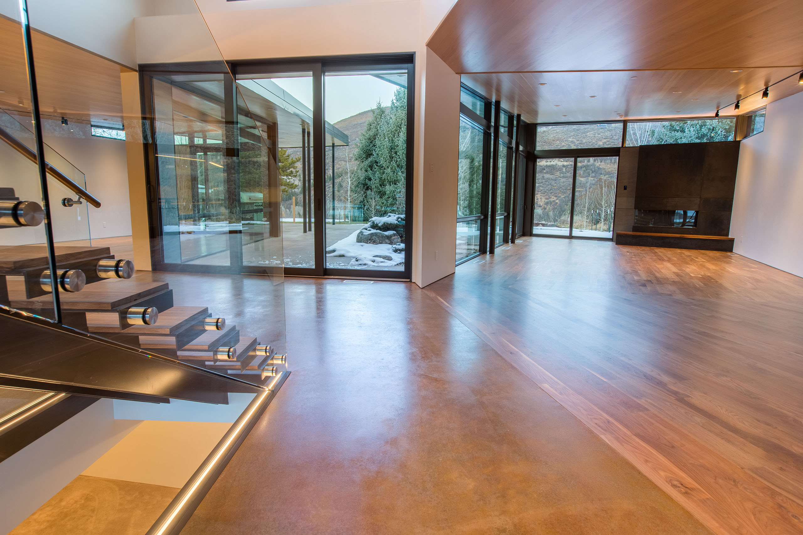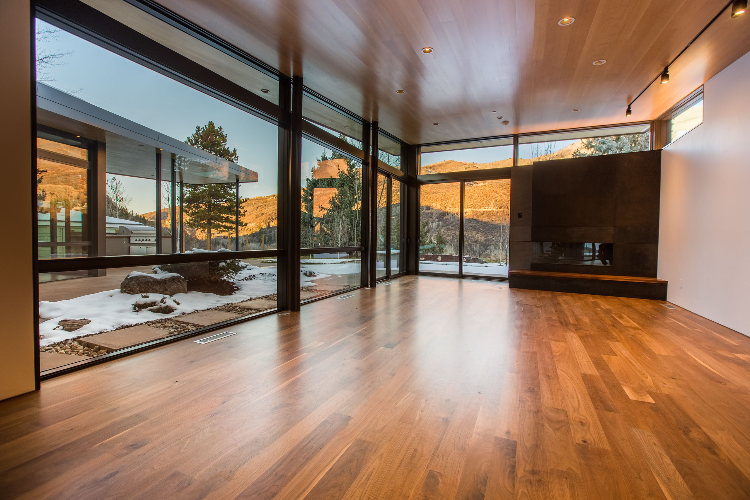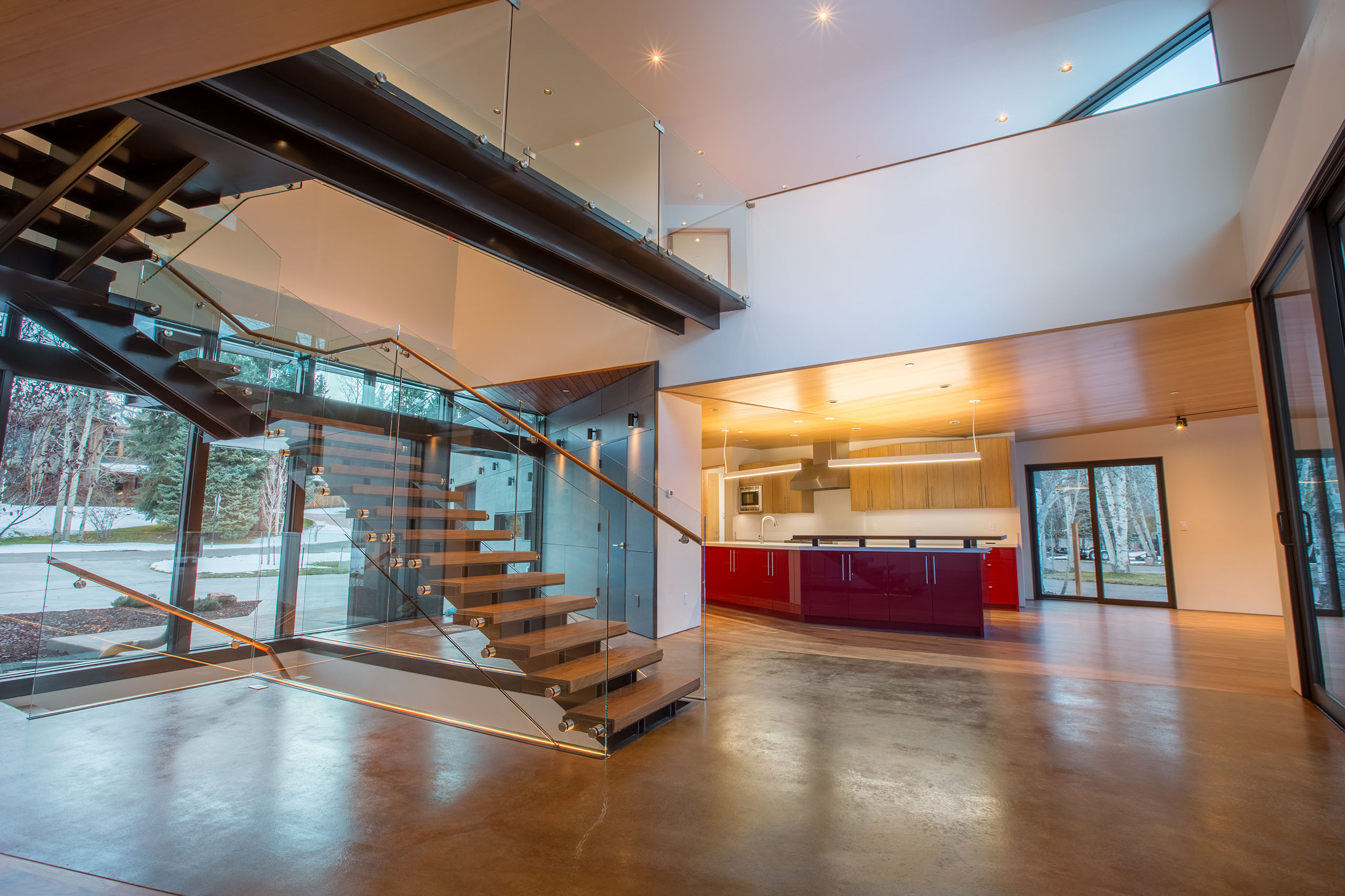 The unusual roof lines of the house are designed to maximize views by raising the roof / ceiling lines toward Aspen Mountain, Aspen Highlands, and Red Mountain.