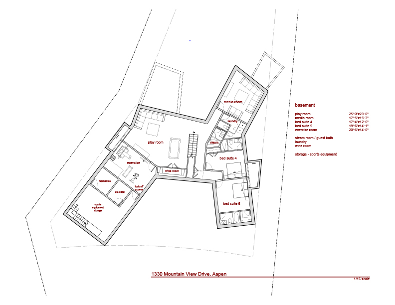 The central volume created between these wings forms the entry volume - the double height central volume of the house containing a steel stair structure connecting both above grade spaces with the basement, which contains two additional bedroom suites, large kid’s bedroom. wine room, exercise room and media room.