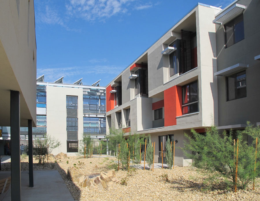An award winning design focused on sustainability and quality of life for senior residents that delivers a highly livable garden-centered community in a challenging urban/industrial environment. The project is the first net-zero energy affordable housing project powered solely by the sun and the wind. All electricity consumed on site is generated on site. No fossil fuels are burned on this site giving this project one of the lowest carbon footprints of any affordable housing communities in the country. The project has achieved LEED for Homes Platinum certification and Enterprise Green Communities certification.