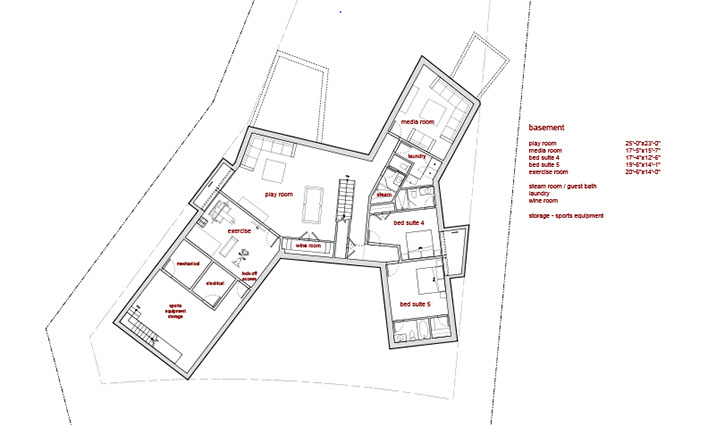 The central volume created between these wings forms the entry volume - the double height central volume of the house containing a steel stair structure connecting both above grade spaces with the basement, which contains two additional bedroom suites, large kid’s bedroom. wine room, exercise room and media room.