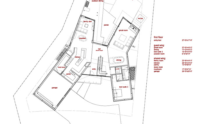 The east wing is programmatically dedicated to guest functions; great room, dining area, and guest bedroom suite. The east wing contains the family living functions; garage, mud room, pantry, kitchen and family living room.